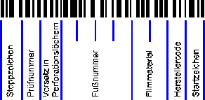 Neben den Fußnummern werden auch alle anderen aufbelichteten Filmkennzeichnungen (z.B. Hersteller, Filmtyp usw.) in den Strichcode übernommen. Die Reihenfolge der Codierung ist aus der Grafik zu ersehen, wobei sich der (gedachte) Filmanfang auf der rechten Seite befindet. | ![]() |